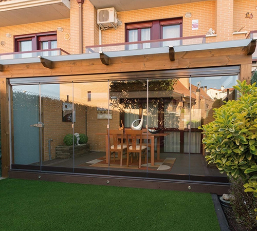 - Apertura flexible: Los paneles de cristal son deslizantes y abatibles, lo que te permite abrir o cerrar completamente el espacio según tus necesidades, aprovechando al máximo el espacio exterior en cualquier época del año.